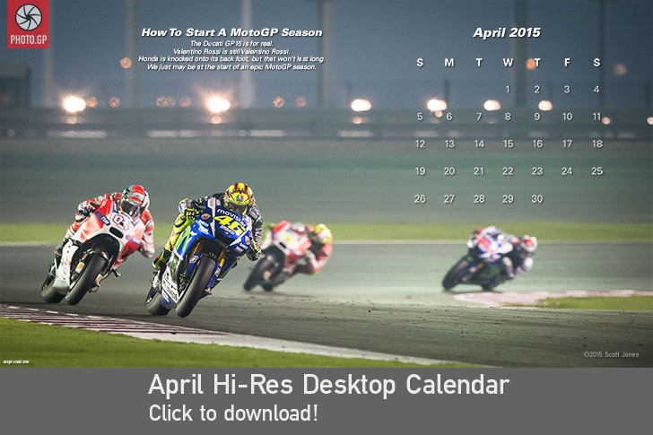 PHOTO.GP’s April 2015 hi-res desktop wallpaper calendar features Round 1 of the 2015 MotoGP season at Losail, Qatar. It was a fantastic way to start the season, with Ducati putting two riders on the podium and a rejuvenated Valentino Rossi fighting for and then claiming his 83rd premier class victory.